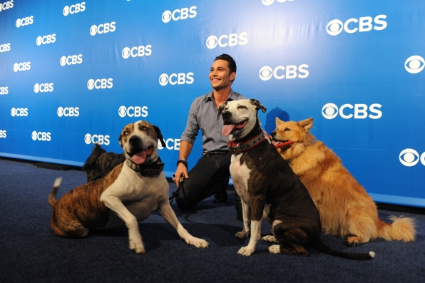 Justin Silver, dog trainer and host of the new CBS series Dogs In The City at the CBS Upfront with some furry friends.